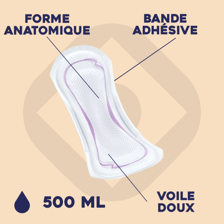 Capacité d’absorption optimale : jusqu’à 500 ml, suffisante pour toutes les situations du quotidien, de jour comme de nuit.