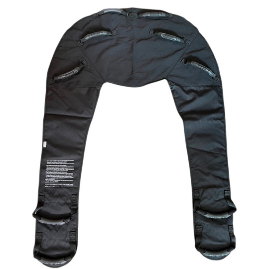 Le harnais est équipé de plusieurs poignées rigides et préformées, positionnées de manière stratégique. Chaque aidant peut choisir une prise adaptée à sa position, à sa taille et à son rôle dans le transfert. Cette organisation favorise la coordination et limite les gestes parasites.
