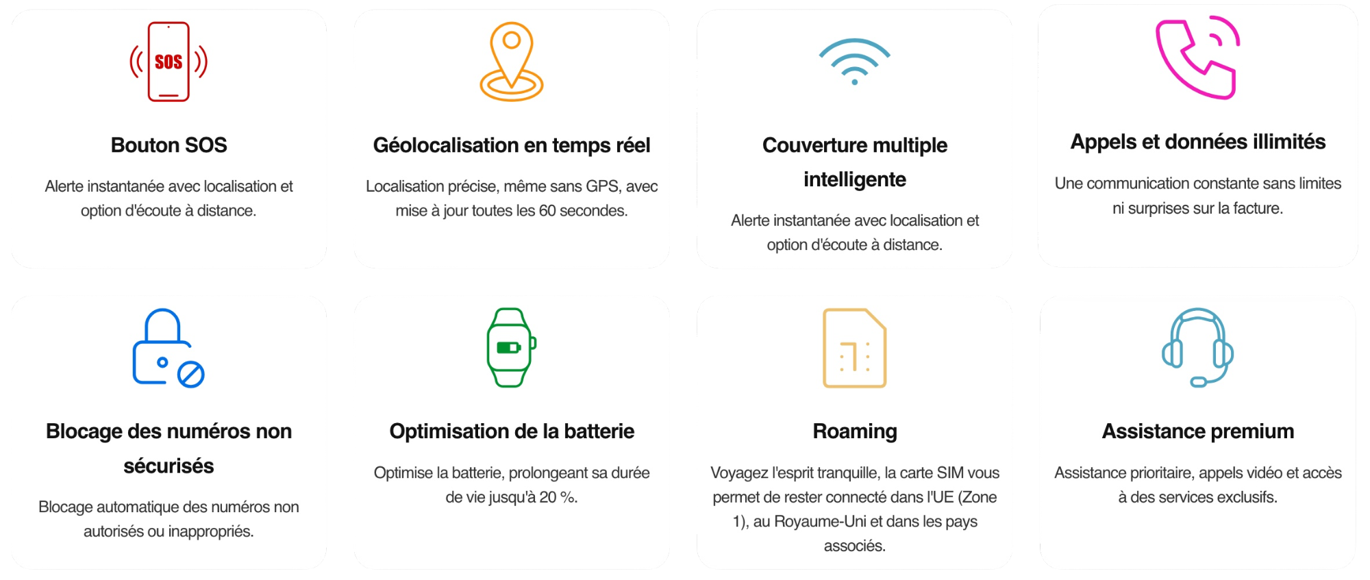 Seuls les numéros autorisés peuvent contacter la montre. Cela évite les appels indésirables et renforce la sécurité de l’utilisateur.