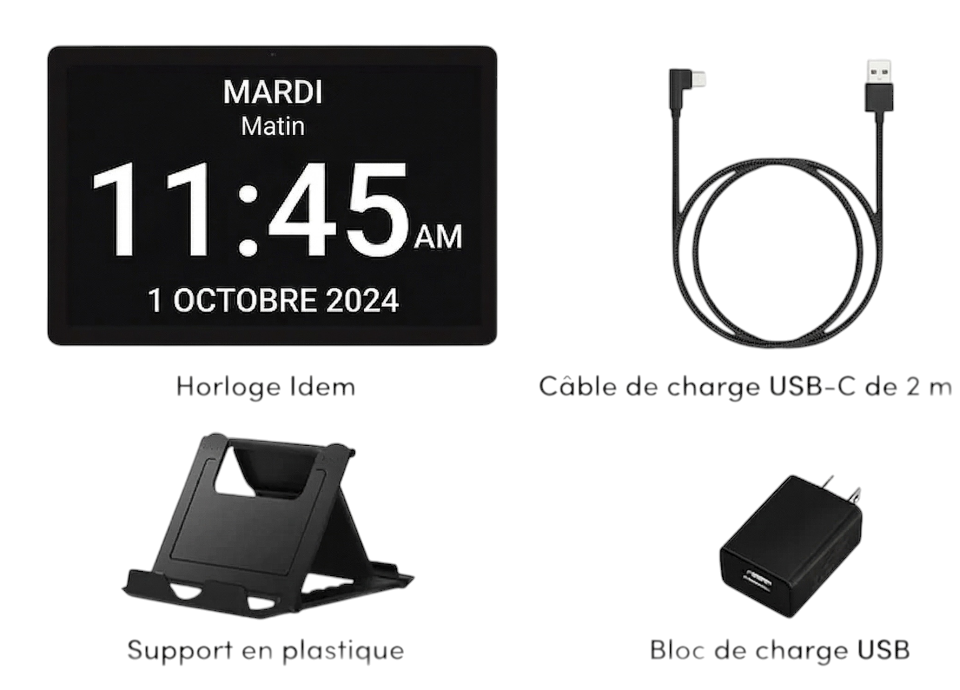 Contrairement à une horloge classique, l’horloge intelligente Idem ne se contente pas d’indiquer l’heure. Elle affiche des informations complètes et lisibles, avec des mots simples. Cela permet à l’utilisateur de comprendre immédiatement où il se situe dans la journée, sans effort de réflexion.