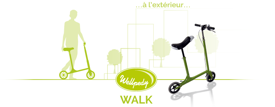 Le Wellpedy est une aide à la marche inspirée de la draisienne du XIXème siècle, visant à favoriser l’autonomie et le maintien à domicile. Cette solution se veut une alternative aux déambulateurs et fauteuils roulants, grâce à la marche « assis – debout », qui libère 90% du poids du corps. Ce dernier se réparti ainsi sur la selle du Wellpedy et non sur les jambes de l’utilisateur, ce qui contribue à pallier aux difficultés motrices, mais aussi aux douleurs corporelles, d’articulations, ou encore aux problèmes de dos et d’équilibre.