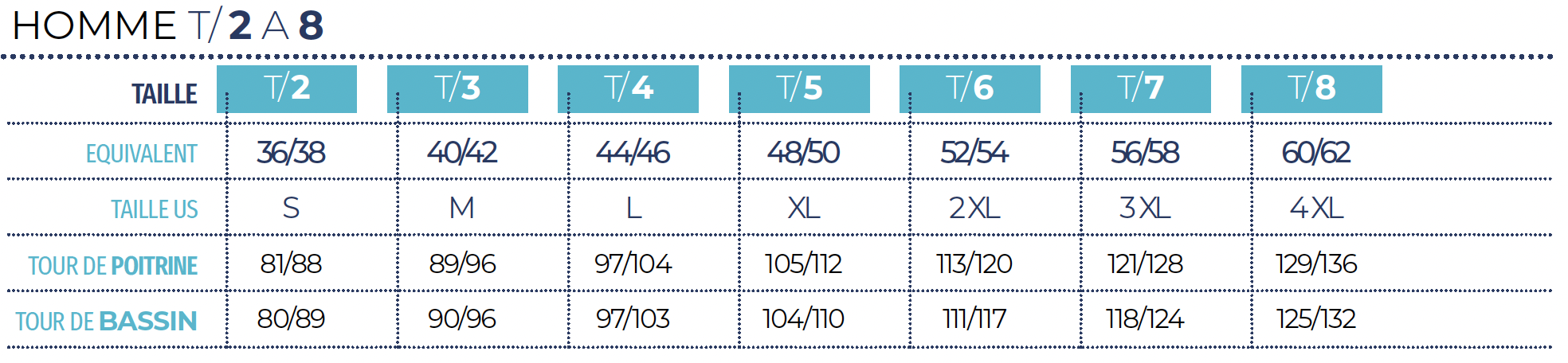 - Taille 2 à 8 (voir tableau d'équivalences)